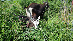 The downside to the electric fence? Well, now the goats only have about 1/4 of the original pasture to graze. So currently the rest of the pasture is very overgrown, and I'm feeding extra grain to make up for the smaller pasture. The plan is to use electric fence to divide the rest of the pasture into paddocks so that we can do rotational grazing, but we haven't gotten around to it yet.