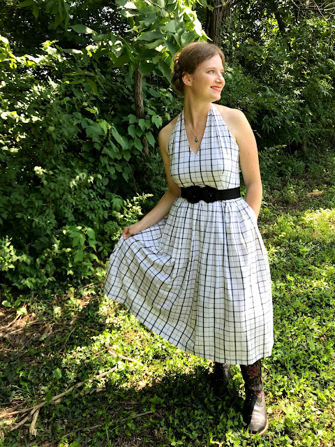 Immediately, this plaid beauty brought to mind a 3 yard length of the softest, floaty-est, white and black plaid linen I happened to have in my stash. No, white and black isn't quite the purple shown in the show, but the plaid had the same feel to it. This once upon a time thrift store acquired fabric was begging to be turned into a Mrs. Maisel inspired halter dress.