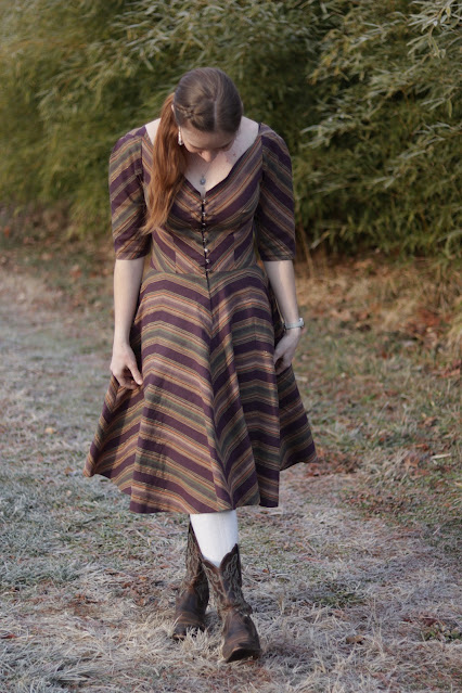 I would have felt more comfortable if I'd had 4 yards of fabric to work with for this design, rather than just 3, but with careful cutting and a little inconspicuous piecing on one of the back skirt panels and a sleeve, I made it work.