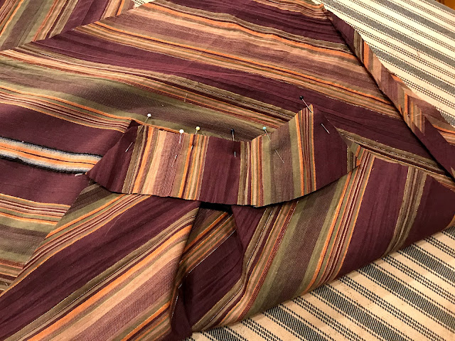 Pattern sorted, out came the fabric! 3 yards cotton, found at a thrift store several years ago, with a fantastic irregular stripe pattern featuring metallic threads running through it. It didn't exactly match the Claire McCardell dress fabric, but it had the right overall feel.