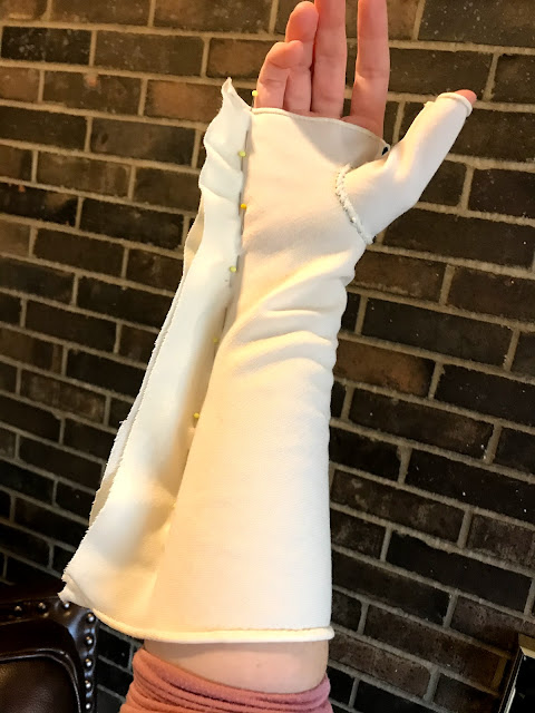 The idea for these mitts came about last summer when I was planning my "Felicity Work Dress". On the cover of the 6th Felicity book Changes for Felicity, Felicity is wearing her work dress (which I based my dress off of), her red cloak, and a pair of white mitts. Of these garments, I only managed to make myself the dress by my self-imposed October deadline, but I did intend to get around to the other two eventually.